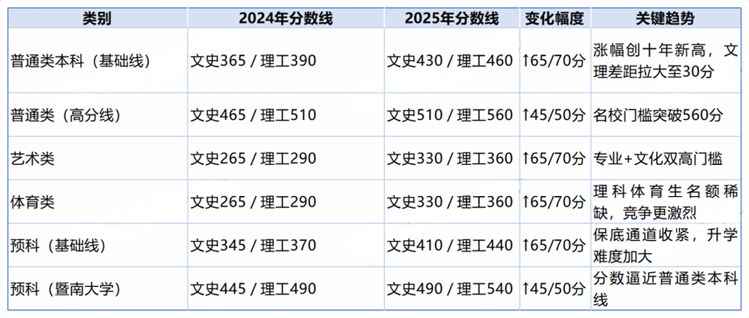 分数线:文史类最低控制线达405分(↑65),理工类415分(↑70)