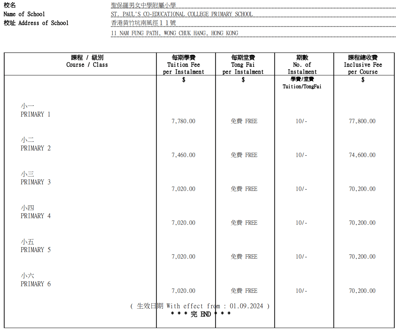 圣保罗男女中学附属小学-学费(全年学费、港币)