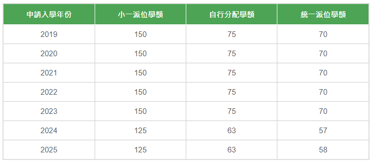 以下列出过去数年的派位数据(自行分配学额及暂定统一派位学额是教育局公布的数字,小一派位总学额是推算出来的)。